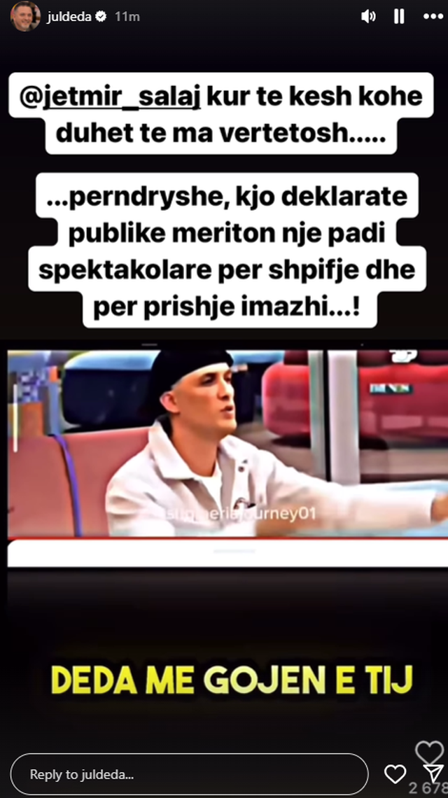 ”Jetmir, kur të kesh kohë duhet të ma vërtetosh…përndryshe, kjo deklaratë publike meriton një padi spektakolare për shpifje dhe për prishje imazhi”.