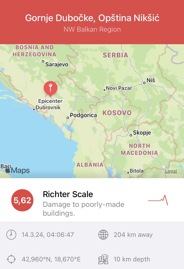 Pas tërmetit me magnitudë 5.6 balle që ka goditur Malin e Zi rreth orës 4 të mëngjesit të kësaj të Enjte, një tjeter termet me magnitude 3.1 balle ka goditur te njejtin.