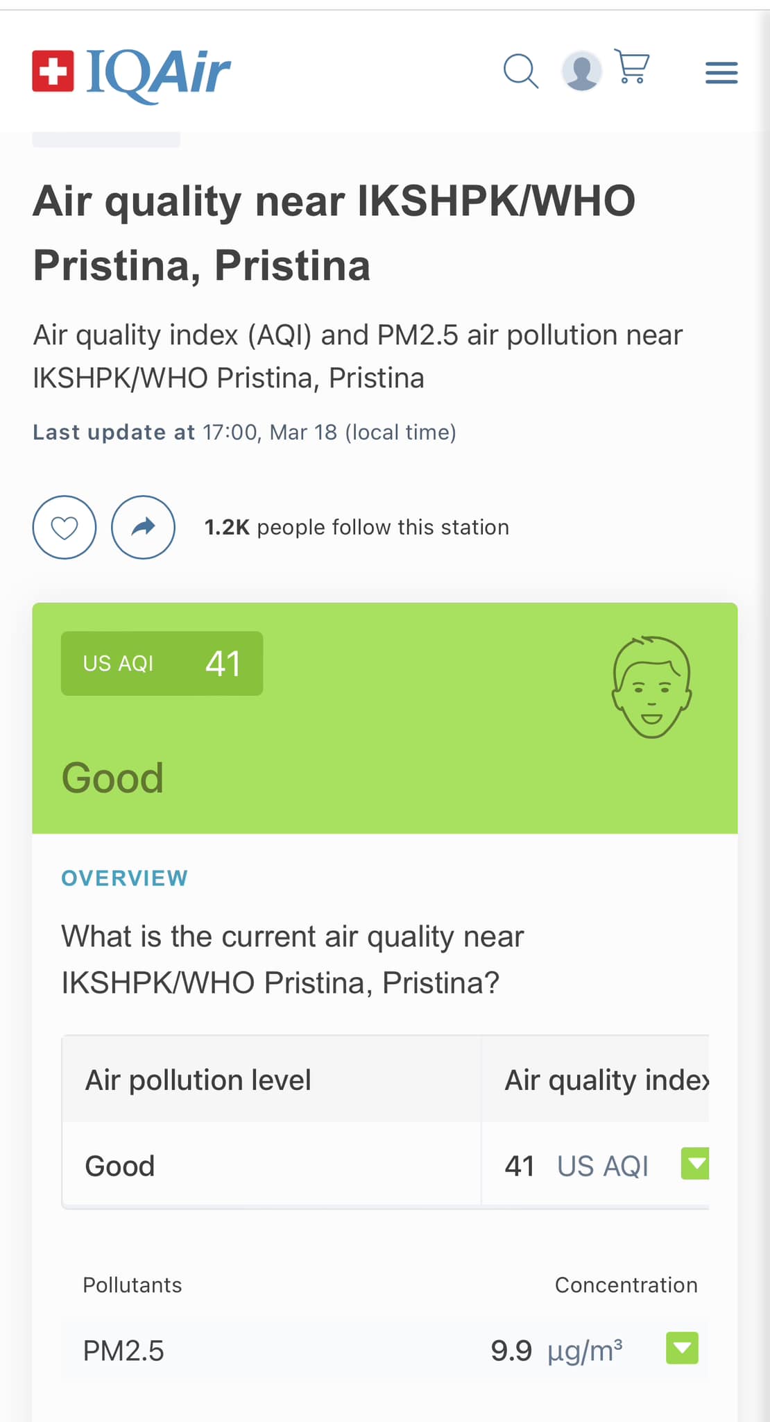 Ndërkaq indeksi i cilësisë së ajrit është 41.