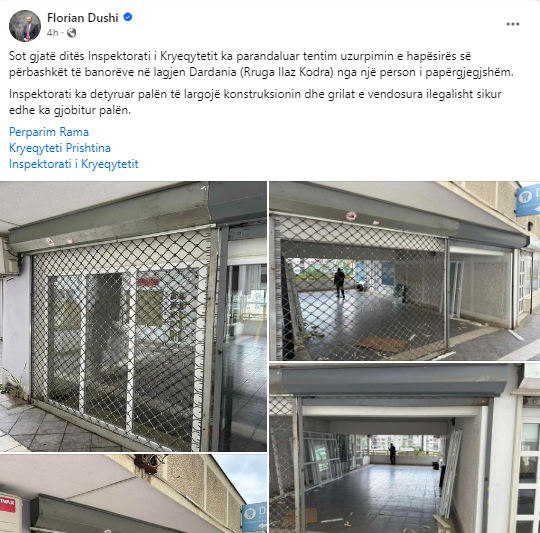 “Sot gjatë ditës Inspektorati i Kryeqytetit ka parandaluar tentim uzurpimin e hapësirës së përbashkët të banorëve në lagjen Dardania (Rruga Ilaz Kodra) nga një person i papërgjegjshëm”, ka shkruar Inspektorati në Facebook.