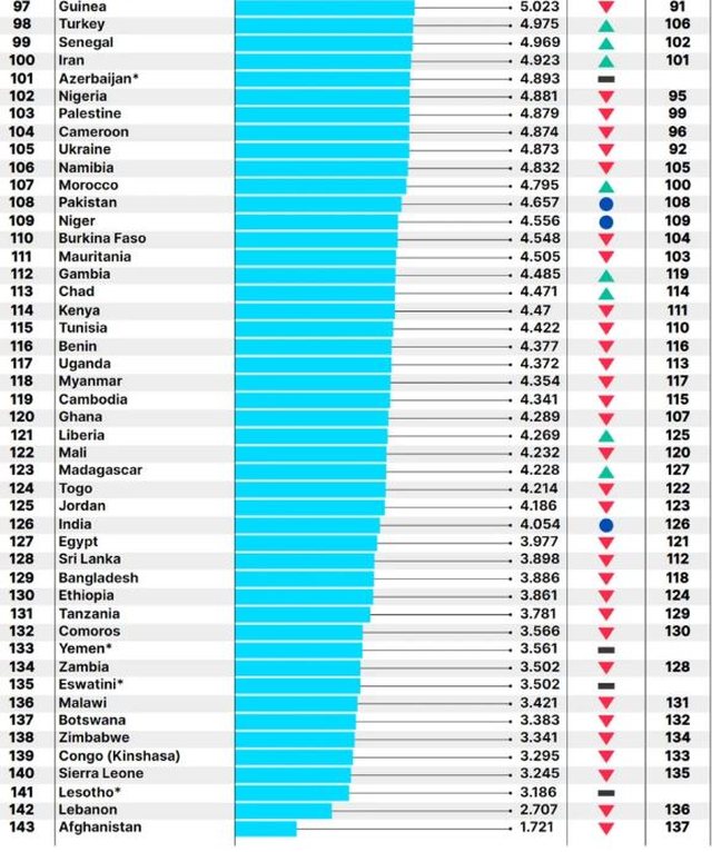 Ndërsa Afganistani, renditet në fund të listës, duke u bërë kështu vendi më i palumtur në botë.