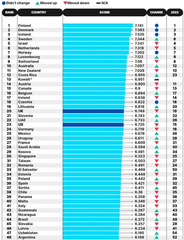 Britania duket se ka rënë në renditje, e cila ishte në vendin e 20-të pas vendeve si Lituania ose Republika Çeke, si dhe SHBA-të, të cilat ranë tetë vende në krahasim me vitin 2023 (vendi i 23-të këtë vit – i 15-ti në 2023).