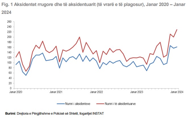 INSTAT raportoi se në muajin Janar 2024 numërohen 162 aksidente rrugore. Në raport me të njëjtin muaj të një viti më parë, aksidentet janë dyfishuar, teksa në janar 2023 u regjistruan 84 aksidente.