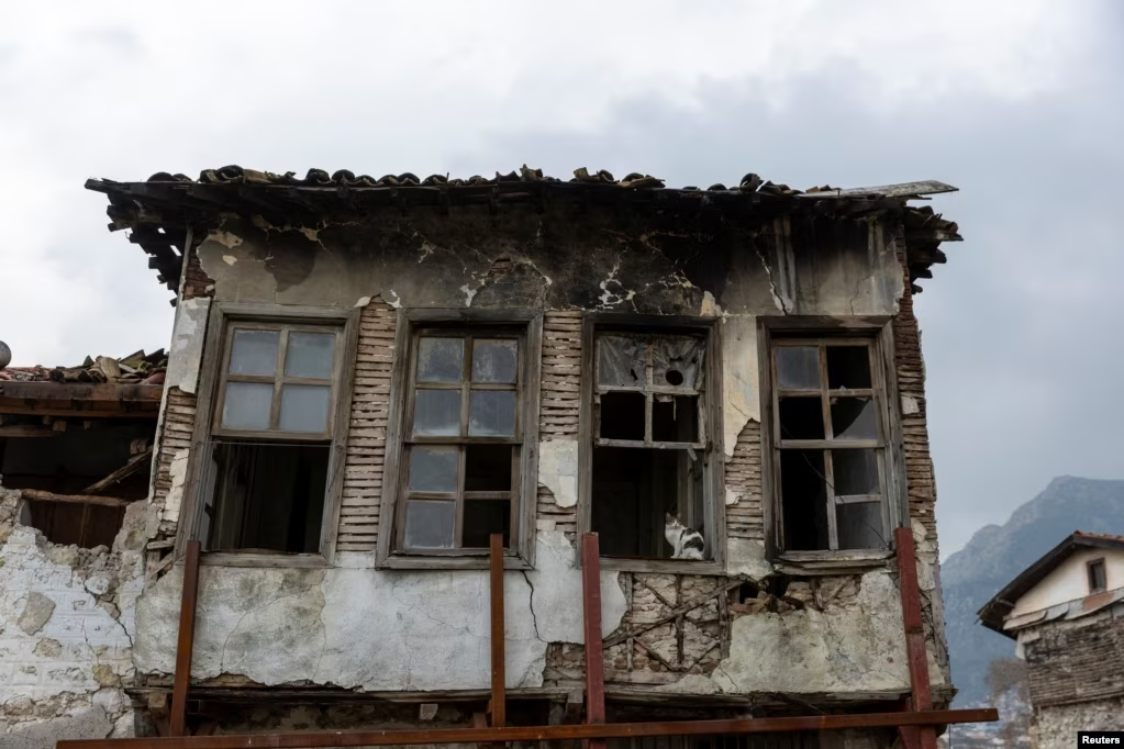 2. Një mace në një dritare të një ndërtese të dëmtuar nga tërmeti i vitit të kaluar, në Hatay, Turqi, 5 shkurt 2024. Tërmetet prej 7.8 ballësh në orët e para të 6 shkurtit 2023, rrafshuan qytete dhe zona të tëra dhe vranë më shumë se 53.000 njerëz në Turqi dhe gati 6.000 në Sirinë fqinje dhe la miliona të pastrehë.