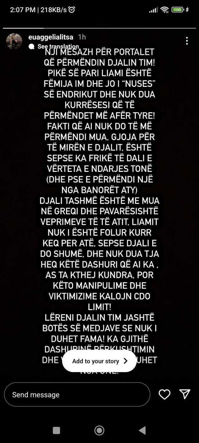 “Një mesazh për portalet që përmendin djalin tim. Pikë së pari, Liami është djali im dhe jo i nuses së Endrikut dhe nuk dua kurrësesi që të përmendet më afër tyre. Fakti që ai nuk do të më përmendë mua, me pretendimin se është për të mirën e djalit, në fakt është sepse ka frikë të dalë e vërteta e ndarjes sonë edhe pse e përmendi një nga banoret aty. Djali tashmë është me mua në Greqi dhe pavarësisht veprimeve të të atit, Liamit nuk i është folur kurrë keq për atë sepse djali e do shumë dhe nuk dua t’ja heq dashurinë që ai ka, as ta kthej kundra por këto manipulime dhe viktimizime kalojnë cdo limit. Lëreni djalin tim jashtë botës së medias se nuk i duhet fama. Ka gjithë dashurinë, përkushtimin dhe vëmendjen që i duhet nga unë”, shkruan ish-partnerja e Endrikut.