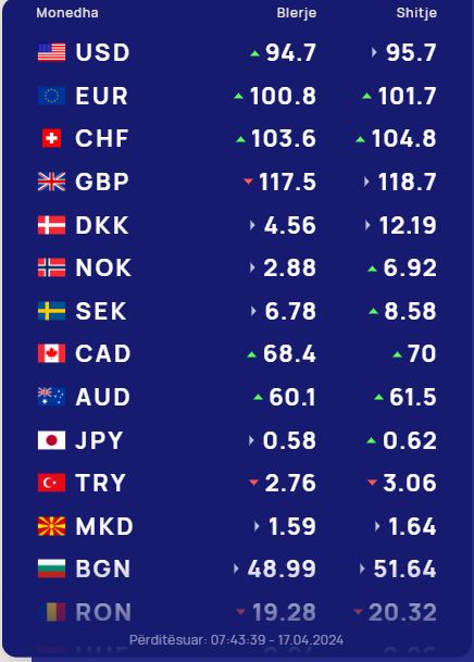 Monedha evropiane euro do blihet me 100.8 lekë dhe do shitet me 101.7 lekë, ndërsa franga zvicerane do blihet me 103.6 lekë dhe do shitet me 104.8 lekë.