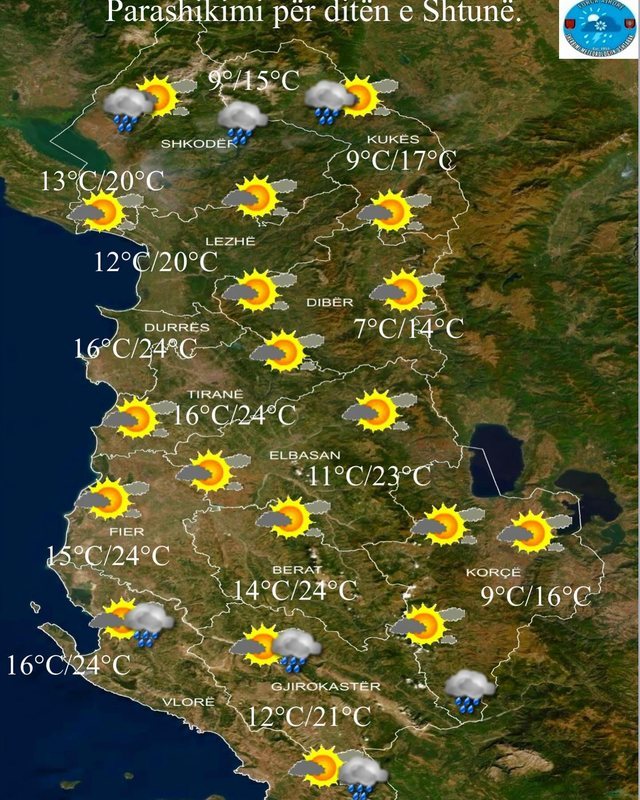Në veri dhe në jug do të jenë prezente reshje lokale shiu me intensitet të ulët, ndërsa vijon të mbetet relativisht intensive era me drejtim nga kuadrati i jugut 2-9 m/s, në bregdet arrin 13-20 m/s, shoqëruar me valëzim në dete të forcës 2-4 ballë. Temperaturat do të pësojnë rritje të lehte në të dyja vlerat.