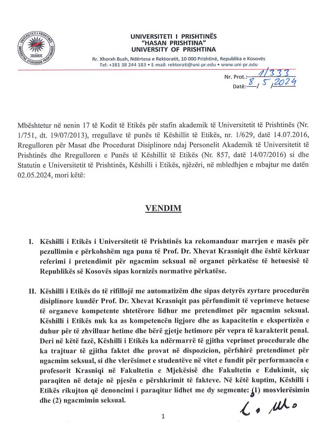“Këshilli i Etikës i Universitetit të Prishtinës ka rekomanduar marrjen e mases për pezullimin e përkohshëm nga puna të Prof. Dr. Xhevat Krasnitit dhe është kërkuar referimi i pretendimit për ngacmim seksual në organet përkatëse të hetuesisë të Republikës së Kosovës sipas kornizës normative përkatëse”.