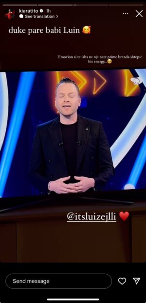 Luiz Ejlli është i ftuari special i natës së sotme në BBV3, ku do të prezantojë këngën e tij të re dhe do të jetë edhe opinionist për natën e sotme. Kiara ka postuar një Instastory ku ka treguar emocionet që ka ndjerë kur ka parë Luizin të rikthehet përsëri në vendin ku ata janë njohur.