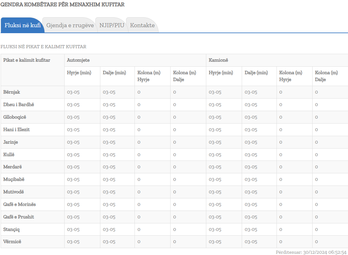 Lajme Kjo është gjendja në pikat kufitare 📅 30 December 2024 🕐 30.12.2024 👁 6 shikime 29 Qendra Kombëtare për Menaxhim Kufitar ka përditësuar të dhënat mbi fluksin në kufi. Aktualisht nuk ka pritje më shumë se 5 minuta për të hyrë e për të dalë nga Kosova në asnjë nga pikat kufitare. kufirigjendje f 𝕏 W T