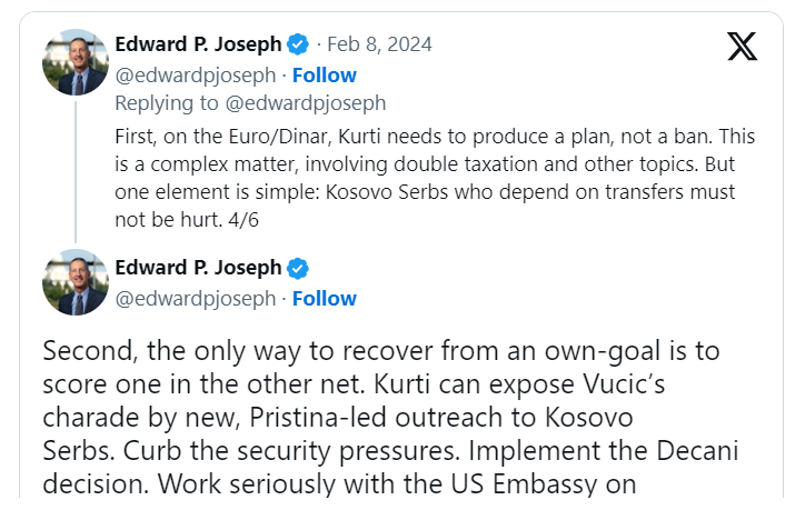 Profesori amerikan i John Hopkins University, Edward Jospeh, ka komentuar pjesëmarrjen e kryeministrit, Albin Kurti mbrëmë në Këshillin e Sigurimit të OKB-së. Jospeh ka kritikuar Kurti, thotë se falë vendimit për dinarin, të pakoordinuar është detyruar të shkojë në këtë seancë.