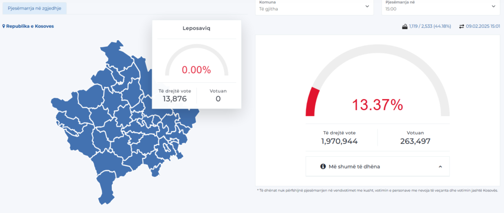 Komisioni Qendror i Zgjedhjeve ka publikuar të dhënat për pjesëmarrjen e qytetarëve në zgjedhje deri në ora 15:00.
