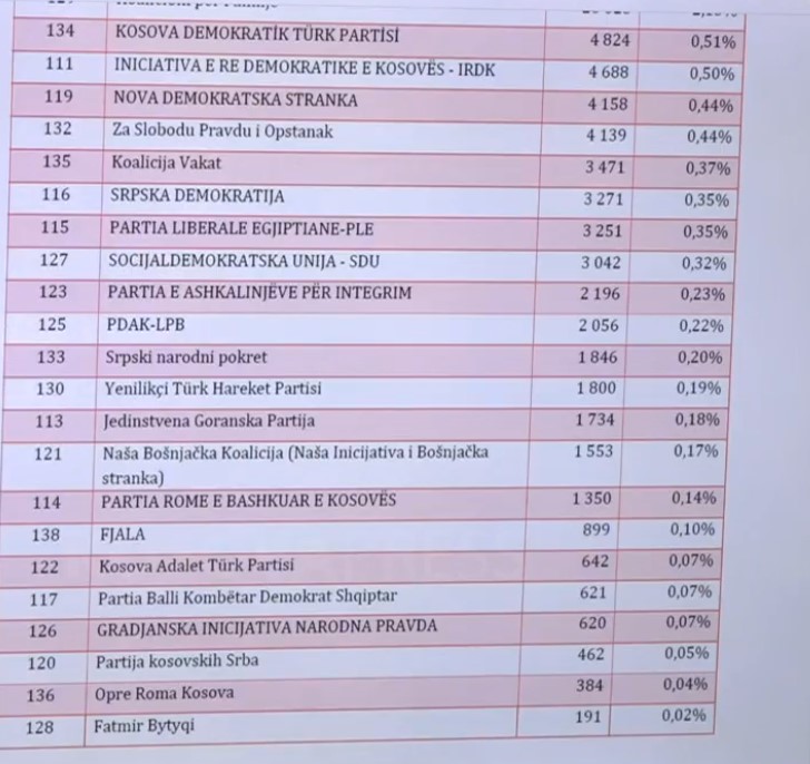 Ndarjet e vendeve në Kuvend për partitë do të jenë si në vijim: LVV 48 ulëse, PDK 24 ulëse, LDK 20 ulëse, Srpska Lista 9 ulëse, AAK-NISMA 8 ulëse, KDP 2 ulëse dhe partitë e komuniteteve me nga 1 ulëse.