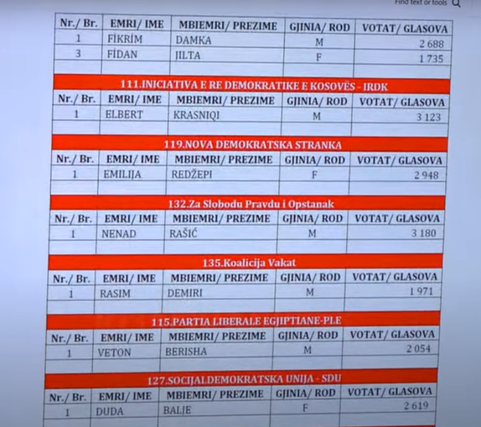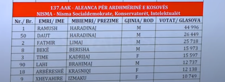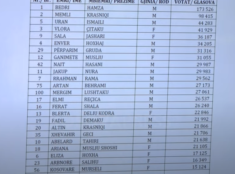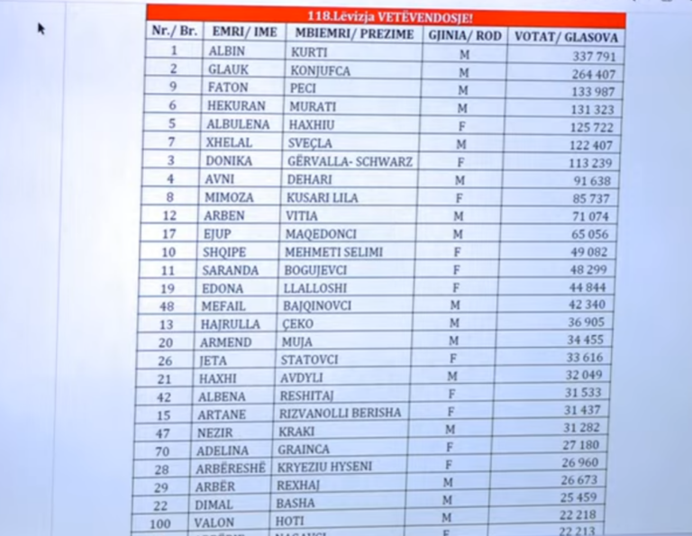 LVV e drejtuar nga Kurti do të ketë plotë 48 deputetë, derisa vetë Kurti i prinë listës me 337 mijë e 791 vota, i ndjekur nga Konjuca me 264 mijë e 407 dhe Faton Peci me 133 mijë e 987.