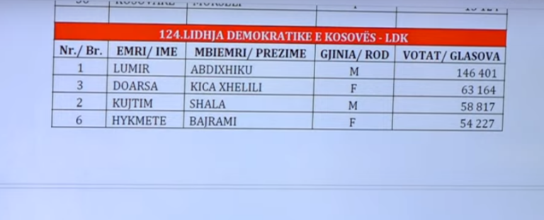 Lidhja Demokratike e Kosovës ka marrë plotë 20 deputet me Abdixhikun si prijës të listës me 146 mijë e 401 vota. Doarsa Kica Xhelili e dyta me 63 mijë e 164 vota, Kujtim Shala me 58 mijë e 817 i treti dhe Hykmete Bajrami me 54 mijë e 227 e katërta.
