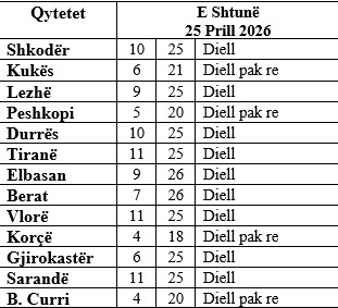 Temperatura maksimale prej 26 gradë Celsius pritet të regjistrohet në Elbasan dhe Berat.