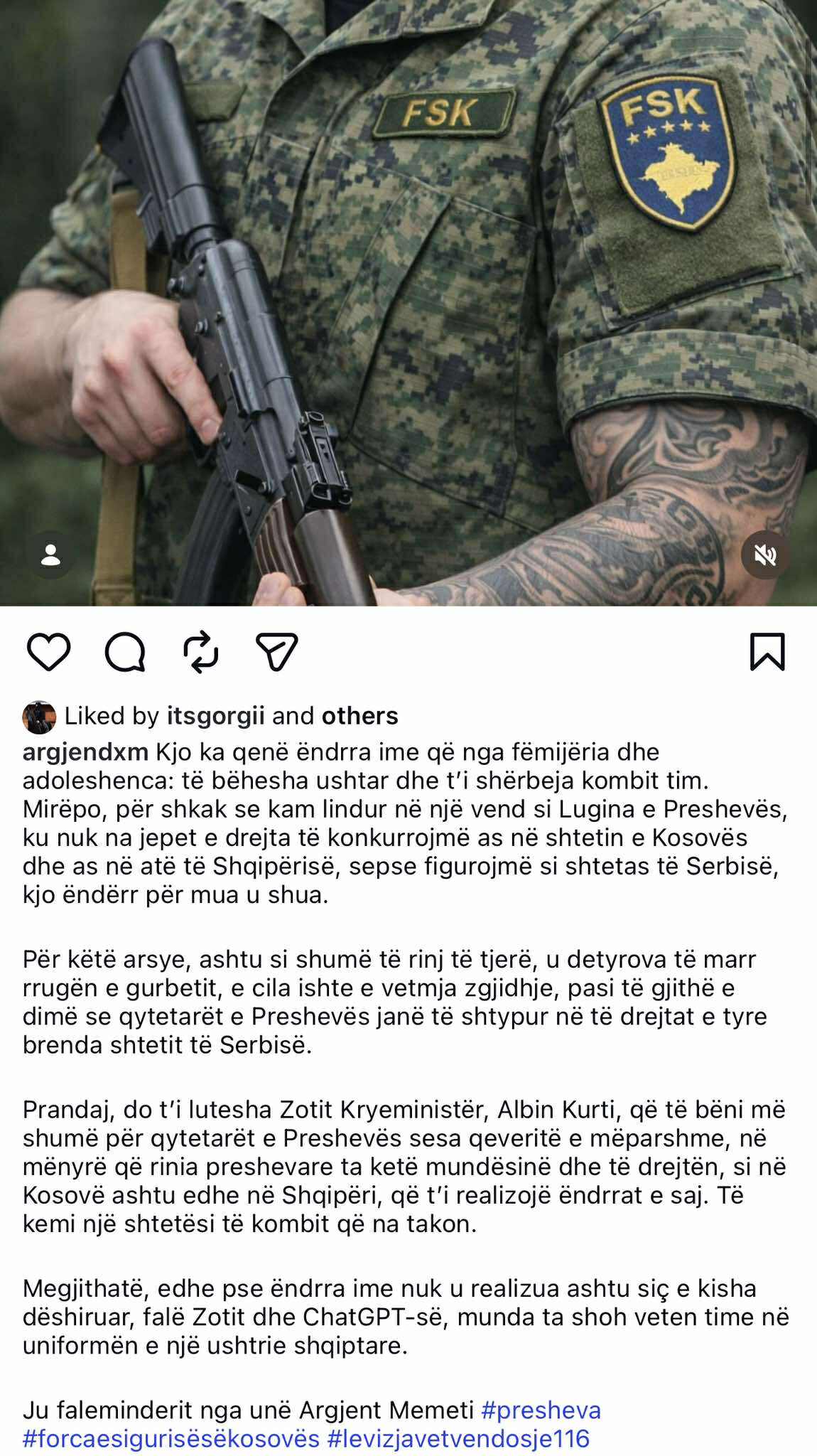 Argjent Memeti, një i ri nga Lugina e Preshevës, ka ndarë publikisht zhgënjimin dhe historinë e tij, duke i drejtuar një apel Kryeministrit të Kosovës, Albin Kurti. Ai rrëfen se ëndrra e tij për t’u bërë ushtar dhe për t’i shërbyer kombit u ndërpre jo për mungesë vullneti, por për shkak të statusit juridik që kanë shqiptarët e Preshevës.