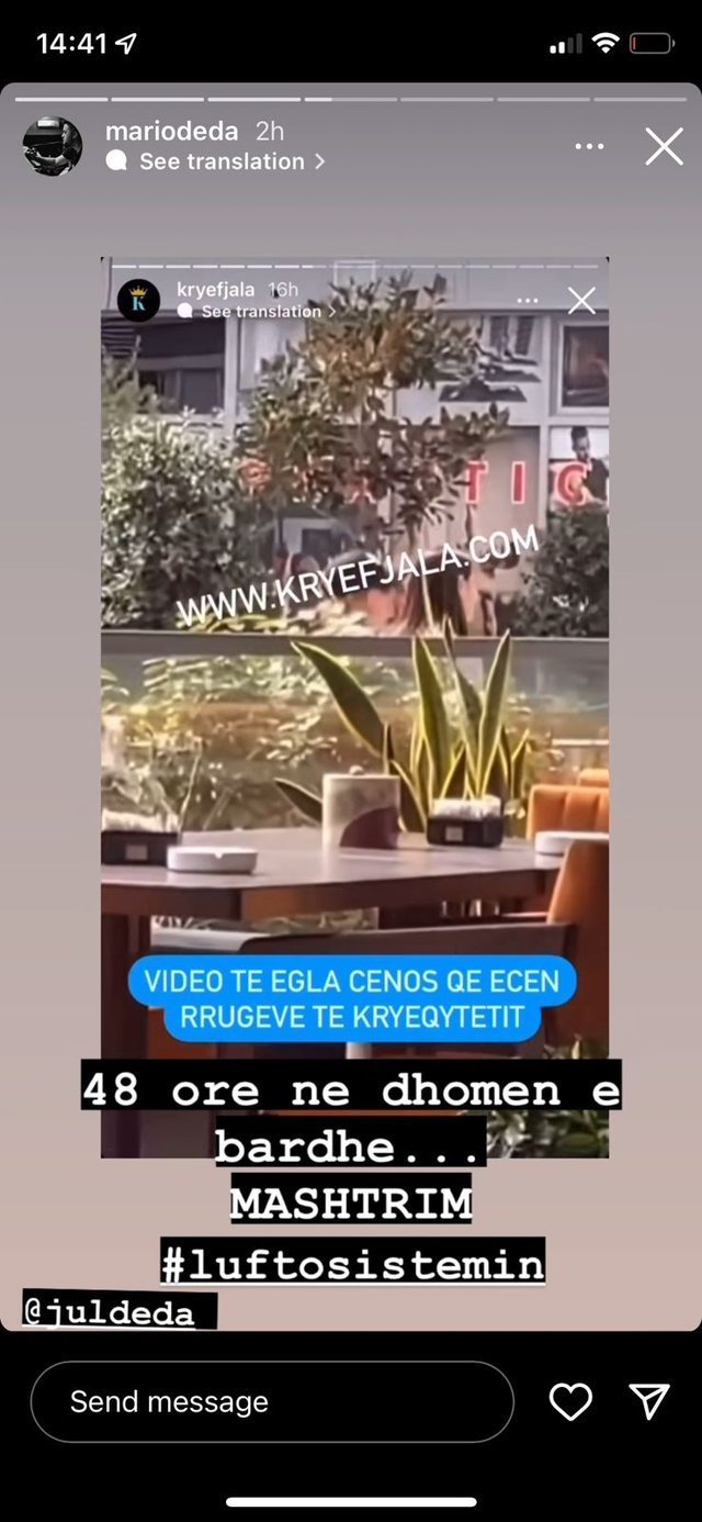 Për këtë ka reaguar dhe vëllai i Jul Dedës, Mario Deda, me anë të një story në rrjetin social “Instagram” ku shkruan se 48-orëshi i Eglës në dhomën e bardhë është mashtrim, teksa publikon një foto tjetër të Eglës duke hipur në një makinë.