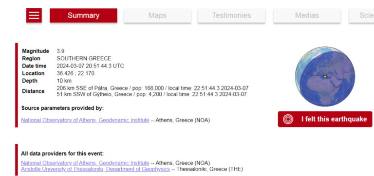 Epiqendra e tërmetit ndodhet 30 kilometra në perëndim-jugperëndim të Gerolimenës me thellësi fokale 8.3 kilometra.