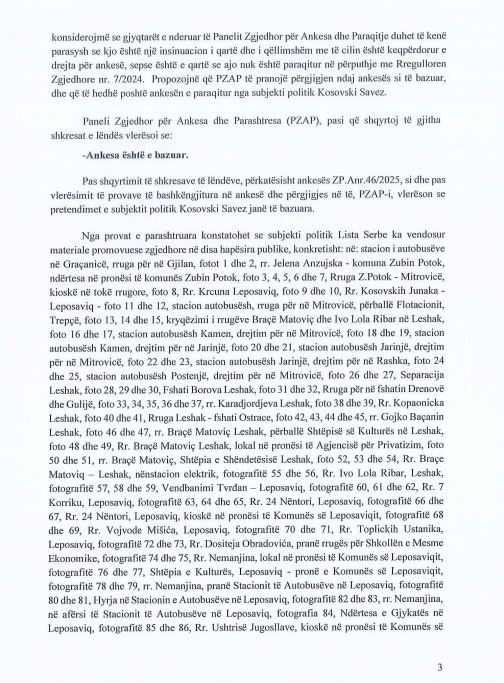 Sipas vendimit të PZAP-it, ankesa e paraqitur nga subjekti politik Kosovski Savez, me seli në Leposaviq, është pranuar si e bazuar. Ankesa, e regjistruar me numrin ZP.Anr.46/2025 dhe e datës 26 dhjetor 2025, ka konstatuar se Lista Serbe ka shkelur Kodin e Mirësjelljes për subjektet politike, mbështetësit e tyre dhe kandidatët gjatë fushatës zgjedhore, transmeton Klankosova.tv.