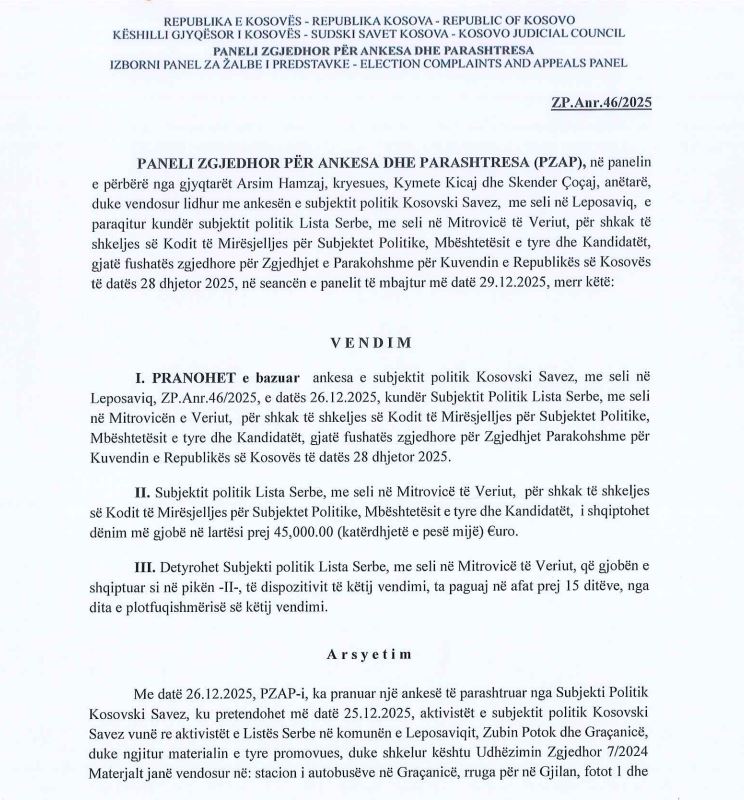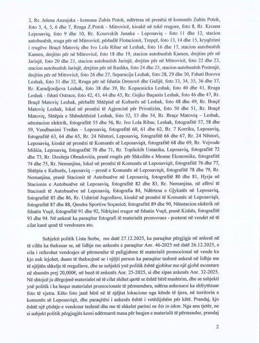 “PRANOHET e bazuar ankesa e subjektit politik Kosovski Savez, me seli në Leposaviq, ZP.Anr.46/2025, e datës 26.12.2025, kundër Subjektit Politik Lista Serbe, me seli në Mitrovicë të Veriut, për shkak të shkeljes së Kodit të Mirësjelljes për Subjektet Politike, Mbështetësit e tyre dhe Kandidatët, gjatë fushatës zgjedhore për Zgjedhjet e Parakohshme për Kuvendin e Republikës së Kosovës të datës 28 dhjetor 2025. Subjekti politik Lista Serbe, me seli në Mitrovicë të Veriut, për shkak të shkeljes së Kodit të Mirësjelljes për Subjektet Politike, Mbështetësit e tyre dhe Kandidatët, shqiptohet dënim me gjobë në lartësi prej 45,000.00 (katërdhjetë e pesë mijë) Euro”, thuhet në vendim.