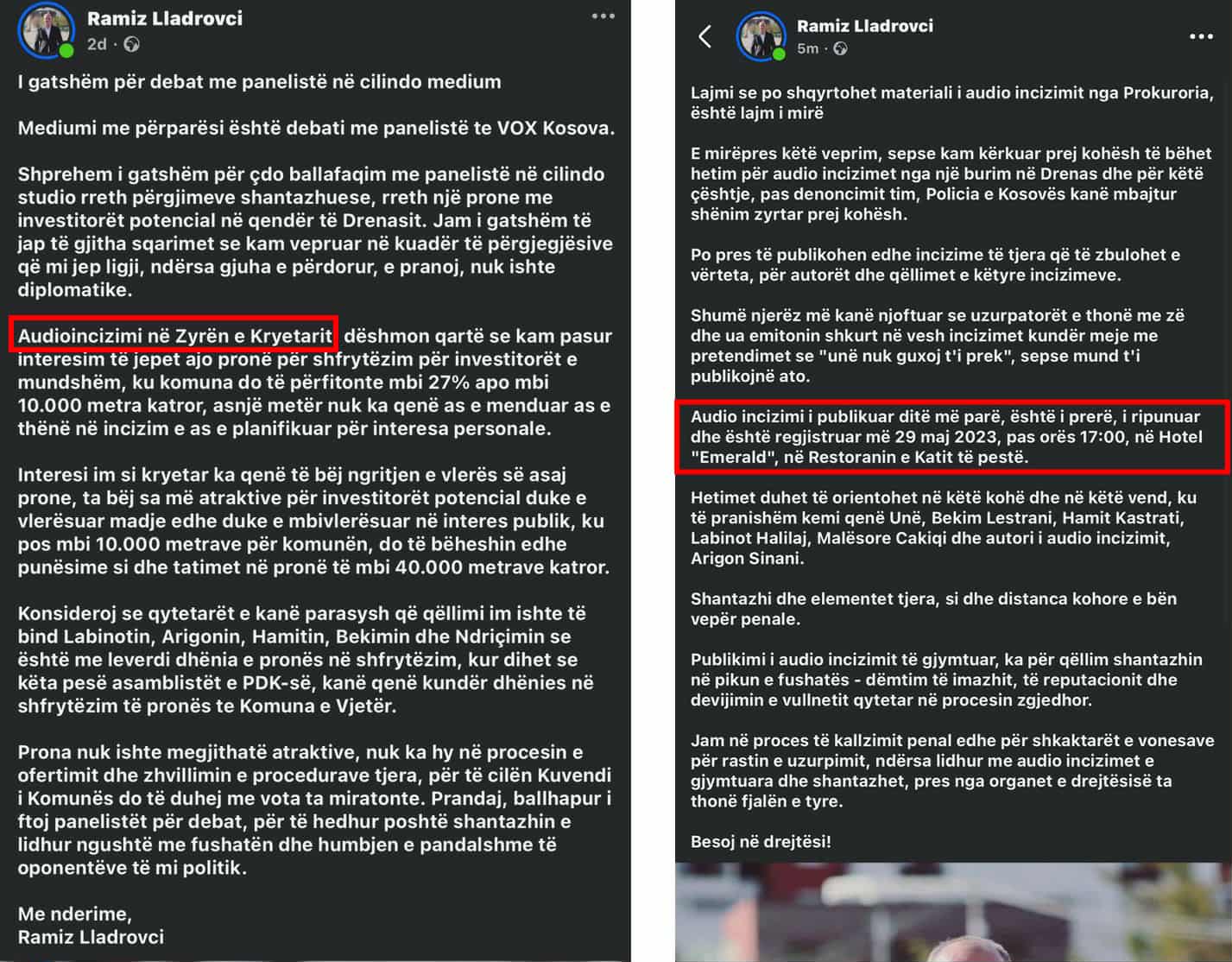 Ramiz Lladrovci fillimisht kishte deklaruar publikisht se audio-incizimi i publikuar ishte bërë në Zyrën e Kryetarit të Komunës. Por, vetëm pak ditë më vonë – pasi u tha nëpër media që Prokuroria është duke shqyrtuar materialin – Lladrovci ndryshoi qëndrim, duke thënë se takimi ishte zhvilluar në Hotel “Emerald”, në Restorantin e katit të pestë, më 29 maj 2023.