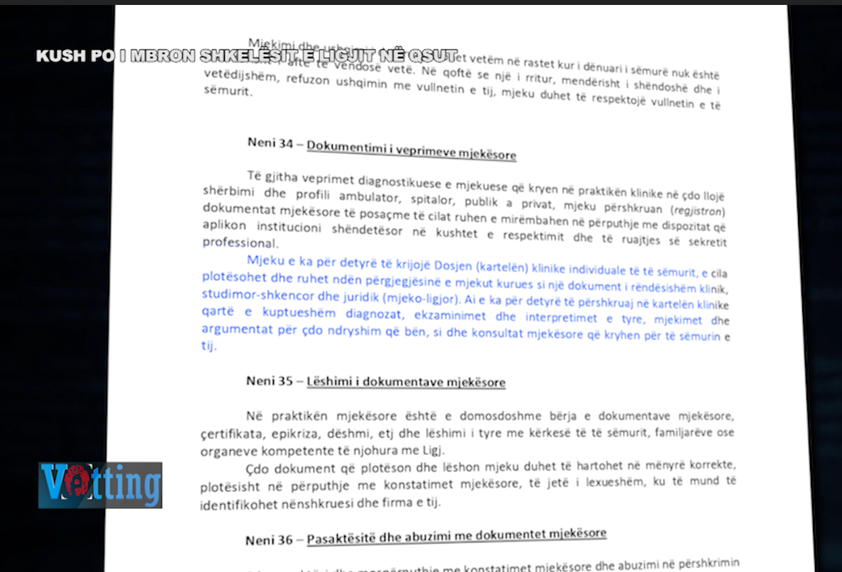 “Sipas nenit 34, paragrafi i dytë i kodit deontologjik, mjeku e ka për detyrë të krijojë Dosjen (kartelën) klinike individuale të të sëmurit, e cila plotësohet dhe ruhet nën përgjegjësinë e mjekut kurues si një dokument i rëndësishëm klinik, studimor-shkencor dhe juridik (mjeko-ligjor). Ai e ka për detyrë të përshkruaj në kartelën klinike qartë e kuptueshëm diagnozat, ekzaminimet dhe interpretimet e tyre, mjekimet dhe argumentat për çdo ndryshim që bën, si dhe konsultat mjekësore që kryhen për të sëmurin e Tij”- thuhet ne Kod. Madje, ky është edhe në brendësi të ligjit nr. 123/2014 për Urdhrin e Mjekëve në Republikën e Shqipërisë.