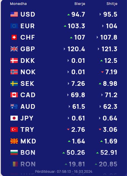 Në tregun e këmbimit valutor shqiptar sot një dollar amerikan do blihet me 94.7 lekë dhe do shitet me 95.5 lekë.