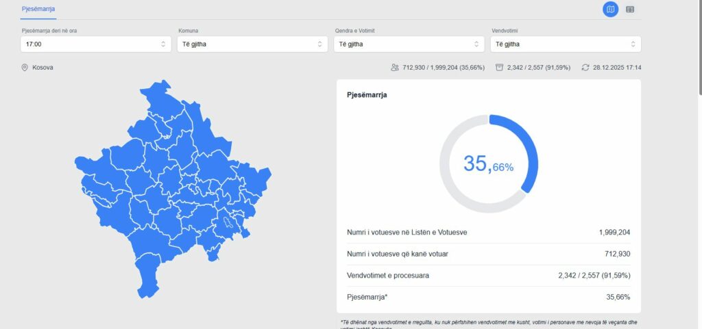 Bazuar në të dhënat e përditësuara nga Komisioni Qendror i Zgjedhjeve, pjesëmarrja e qytetarëve në përqindje është 35.66%.