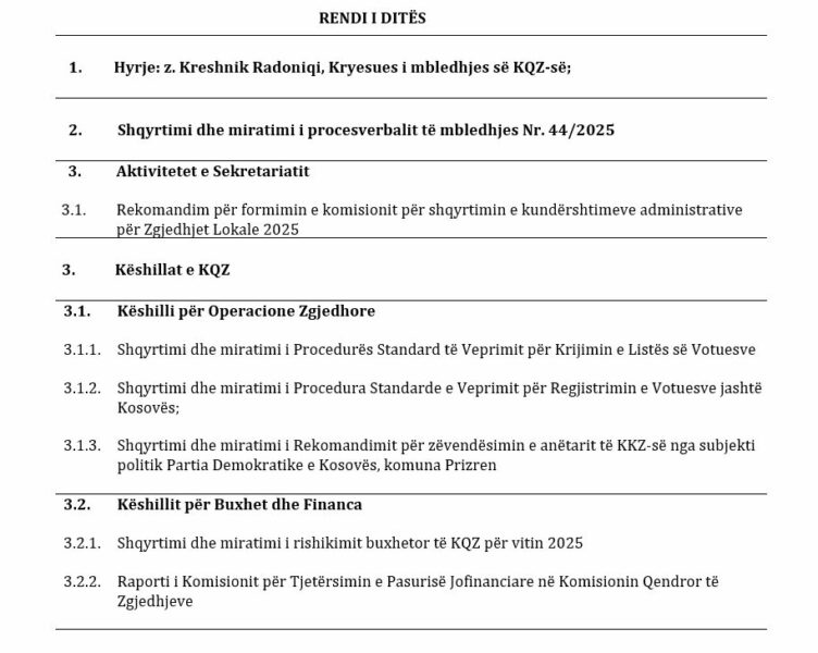 Ndër pikat kryesore të mbledhjes është rekomandimi për formimin e një komisioni të posaçëm për shqyrtimin e kundërshtimeve për Zgjedhjet Lokale të vitit 2025. Po ashtu, pritet të shqyrtohen dhe miratohen disa procedura standarde që kanë të bëjnë me veprimtarinë zgjedhore dhe regjistrimin e subjekteve politike.