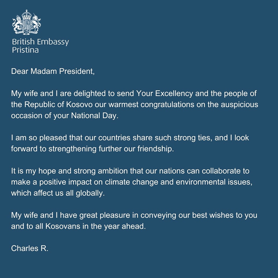 Mbreti Charles ka dërguar një mesazh të veçantë për presidenten Osmani, duke theksuar rëndësinë e miqësisë dhe bashkëpunimit të ngushtë midis dy shteteve.