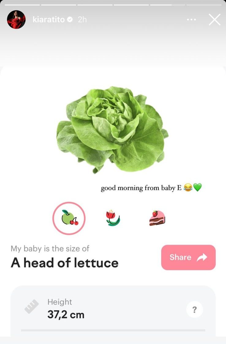 Vetë moderatorja Kiara Tito ka shpërndarë në Instagram një story që tregon madhësinë e foshnjës krahas së cilës shkruan: Mirmëngjes nga bebi E.