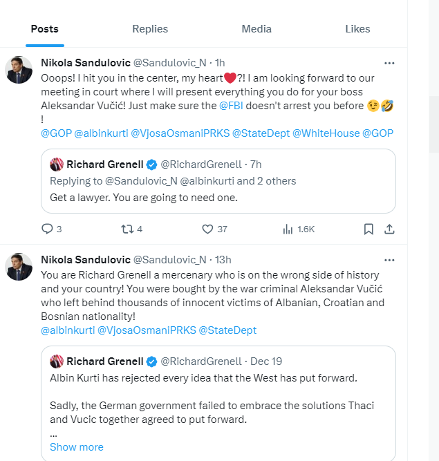 “Ju jeni Richard Grenell një mercenar që është në anën e gabuar të historisë dhe vendit tuaj! Ju bleu krimineli i luftës Aleksandar Vuçiq që la pas mijëra viktima të pafajshme të kombësisë shqiptare, kroate dhe boshnjake”, shkroi Sanduloviq.