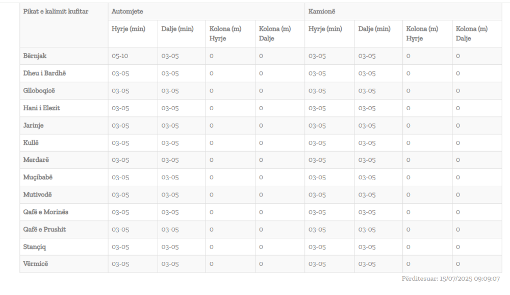 Sipas Qendrës Kombëtare për Menaxhim Kufitar të përditësuara sot në orën 09:00, pritjet në të gjitha vendkalimet me Kosovën nuk janë më shumë se deri në 5 minuta.