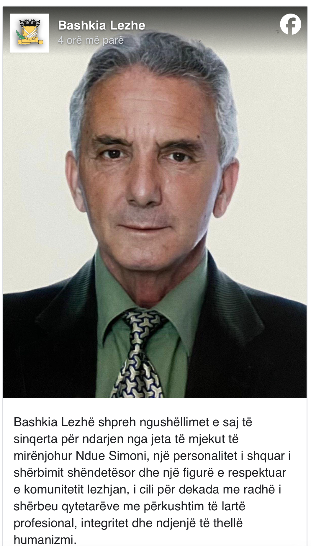 Bashkia e Lezhës ka ndarë lajmin e trishtë, ku mjeku i njohur Ndue Simoni është ndarë nga jeta ditën e sotme.