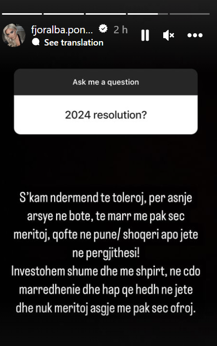 Një ndër pyetjet e bëra, të cilën moderatorja e ka ndarë në profilin e saj në Instastory, thuhej: “Rezolucioni i vitit 2024?”