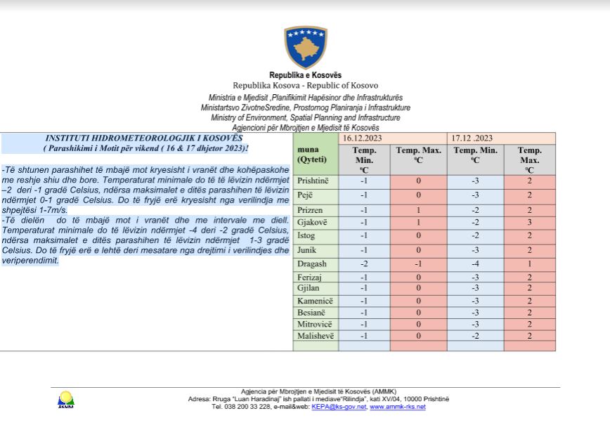 Ndërkaq të dielën parashihet të mbajë mot i vranët dhe me intervale me diell. Temperaturat minimale do të lëvizin ndërmjet -4 deri -2 gradë Celsius, ndërsa maksimalet e ditës parashihen të lëvizin ndërmjet 1-3 gradë Celsius.