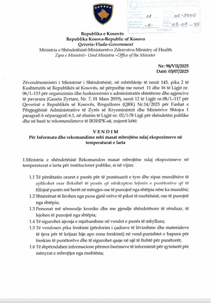 Ministria e Shëndetësisë, në bazë të rekomandimeve të Institutit Kombëtar të Shëndetësisë Publike të Kosovës, ka nxjerrë një vendim ku rekomandon që institucionet publike dhe private të zbatojnë masa mbrojtëse për mbrojtjen e punëtorëve nga temperaturat e larta, për periudhën 03 – 10 korrik 2025.