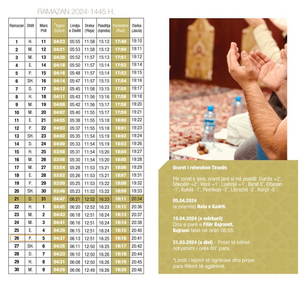 Dita e parë e Ramazanit është më 11 mars, ku koha e syfyrit për vendin tonë përkon në orën 04:23, ndërsa iftari në orën 17:49.