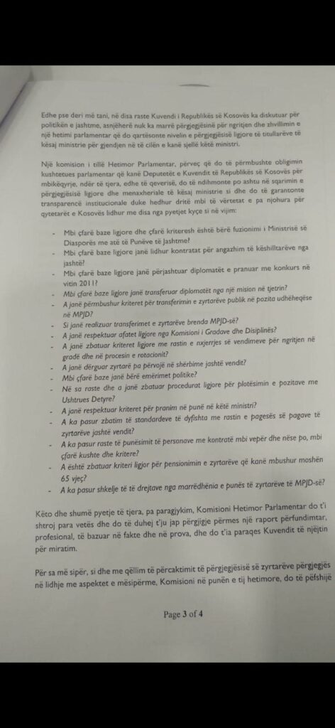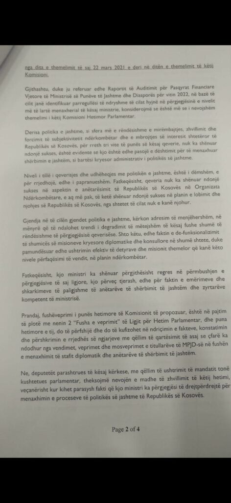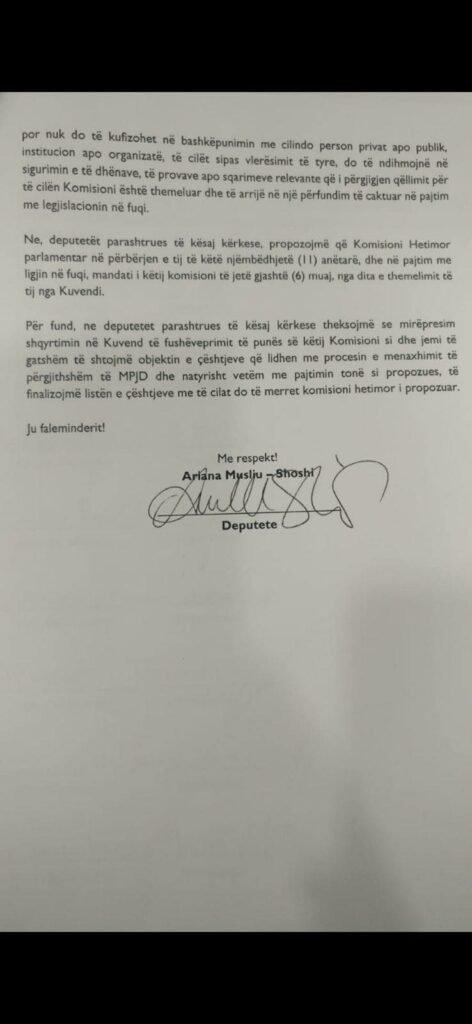 Deputetja nga radhët e PDK-së, Ariana Musliu-Shoshi ka bëre një reagim ndaj Ministres së punëve të Jashtme, Donika Gërvalla në lidhje më agjendën e Këshillit te Sigurimit te OKB-se, të cilin thotë se e ka ndërlidhur me agjendën e Kuvendit te Kosovës, saktësisht me formimin e Komisionit Hetimor Parlamentar për MPJD-në.