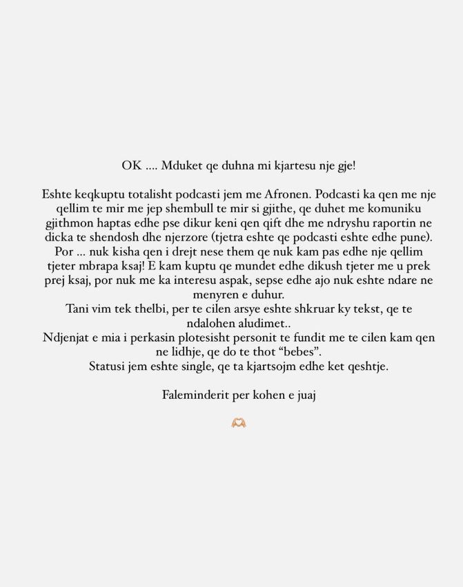 “OK Mduket qe duhna mi kjartesu nje gje! Eshte keqkuptu totalisht podcasti jem me Afronen. Podcasti ka qen me nje qellim te mir me jep shembull te mir si gjithe, qe duhet me komuniku gjithmon haptas edhe pse dikur keni qen qift dhe me ndryshu raportin ne dicka te shendosh dhe njerzore (tjetra eshte qe podcasti eshte edhe pune). Por … nuk kisha qen i drejt nese them qe nuk kam pas edhe nje qellim tjeter mbrapa ksaj! E kam kuptu qe mundet edhe dikush tjeter me u prek prej ksaj, por nuk me ka interesu aspak, sepse edhe ajo nuk eshte ndare ne menyren e duhur.