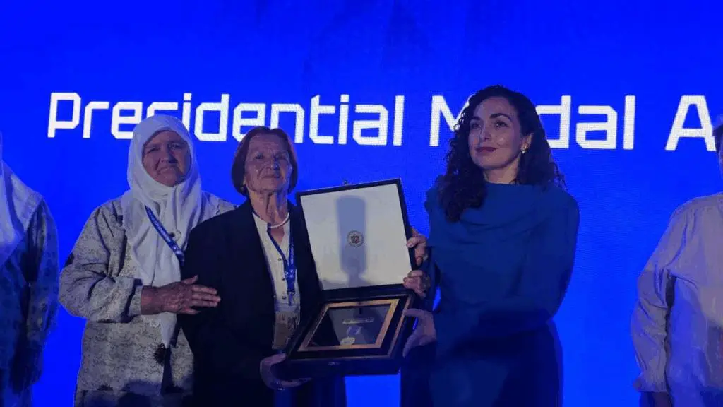 Presidentja e Kosovës, Vjosa Osmani, ka ndarë medalje presidenciale për nënat e Srebrenicës në kuadër të Forumit Ndërkombëtar për Gratë, Paqen dhe Sigurinë që po mbahet në Prishtinë.