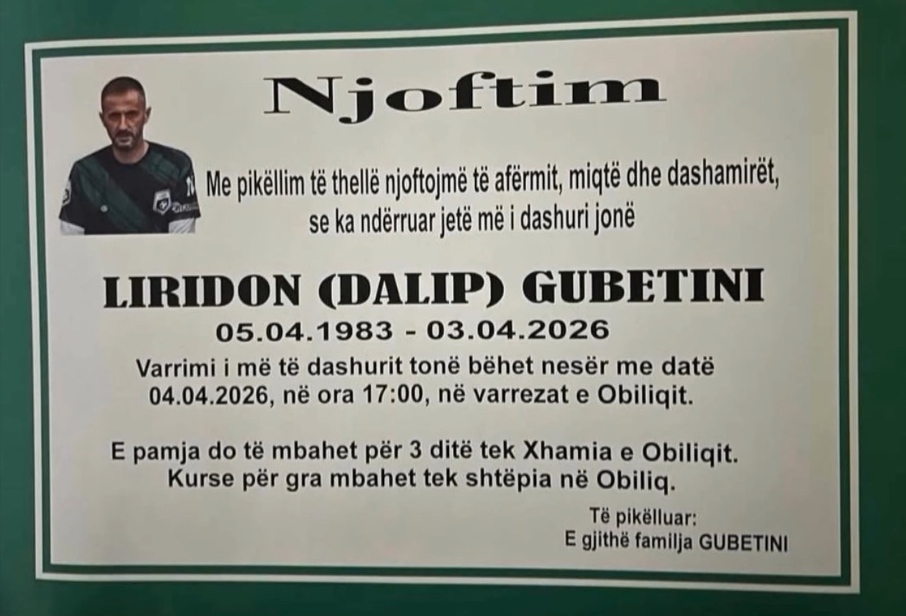 Familjarët kanë njoftuar se varrimi i Liridonit do të bëhet diten e diel, më 05 prill, në varrezat e Obiliqit, në ora 17:00.