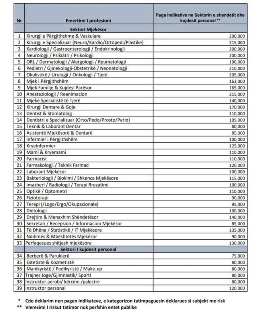 Për estetistët, kozmetistët dhe “make-up artist” paga referuese është 80 mijë lekë. Po aq për instruktorët në aerobi apo kërcim. Për instruktorët personalë në palestër është caktuar paga 120 mijë lekë në muaj.