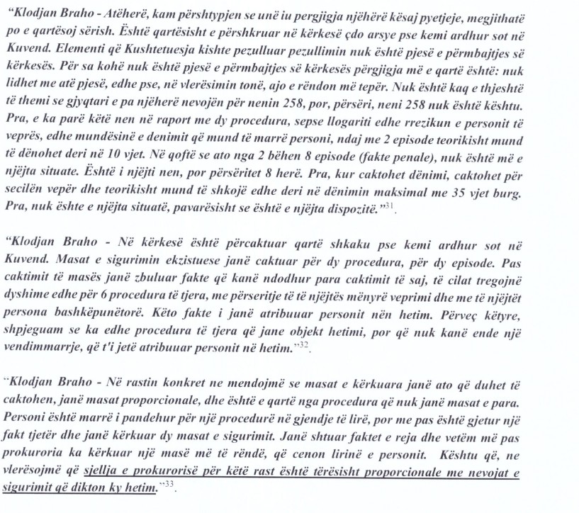 “Pra, e ka parë këtë nen në raport me dy procedura, sepse llogariti edhe rrezikun e personit të veprës, edhe mundësinë e denimit që mund të marrë personi, ndaj me 2 episode teorikisht mund të dënohet deri në 10 vjet. Në qoftë se ato nga 2 bëhen 8 episode (fakte penale), nuk është më e njëjta situate. Është i njëjti nen, por përsëritet 8 herë. Pra, kur caktohet dënimi, caktohet për secilën vepër dhe teorikisht mund të shkojë edhe deri në dënimin maksimal me 35 vjet burg. Pra, nuk ështe e njëjta situatë, pavarësisht se është e njëjta dispozitë.”, theksoi Braho.