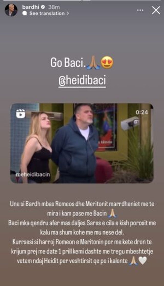 “Unë si Bardh mbas Romeos dhe Meritonit marrëdhëniet më të mira i kam pasur me Bacin. Baci më ka qëndruar afër mbas daljes së Sarës, e cila e kishte porositur të kalonte më shumë kohë me mua nëse dilte. Kurrësesi se harroj Romeon dhe Meritonin por me këtë dron të krijuar prej më datë 1 prill kemi dashur të tregojmë mbështetje vetëm ndaj Heidit për vështirësitë që po i kalonte”, shprehet Bardhi.