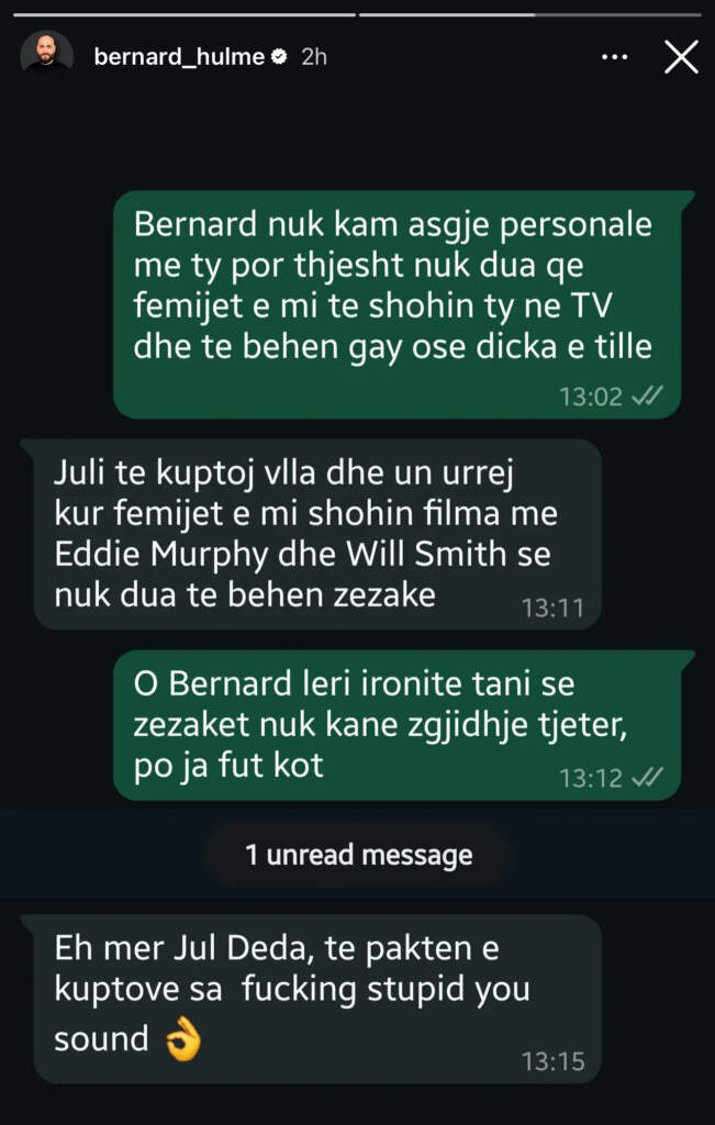 Ish-banori i Big Brother VIP Albania, Bernard Hulme, ka ndarë publikisht një bisedë private me aktorin Jul Deda, ku ky i fundit shpreh qëndrime homofobike.