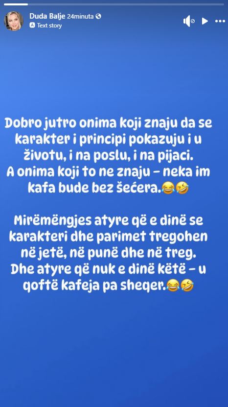 “Mirëmëngjes atyre që e dinë se karakteri dhe parimet tregohen në jetë, në punë dhe në treg. Dhe atyre që nuk e dinë këtë – qoftë kafeja pa sheqer”, ka shkruar Balje.