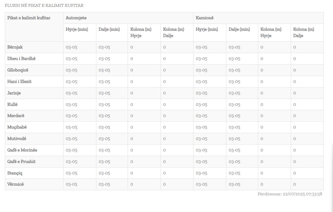 Sipas të dhënave të përditësuara të Qendrës Kombëtare për Menaxhim Kufitar, pritjet janë deri në 5 minuta.