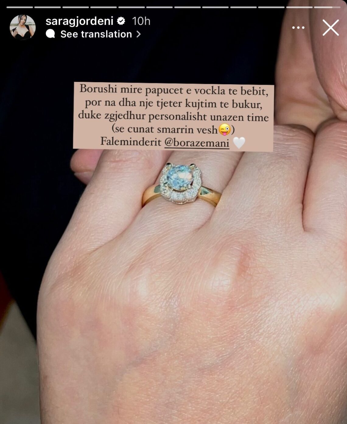 ‘Borushi mirë papucet e vockla të bebit, por na dha një tjetër kujtim të bukur duke zgjdhur personalisht unazën time ( se cunat s’marrin vesh)’- shkruan Sara përkrah fotos së unazës.
